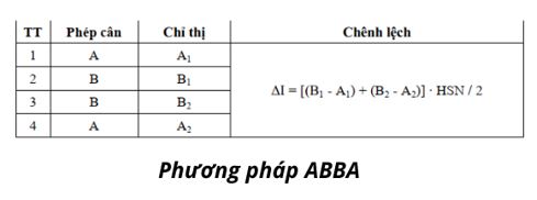 Phương pháp so sánh được sử dụng trong quy trình này là phương pháp ABBA. Trong phương pháp này, tiến hành 4 phép cân theo thứ tự trong bảng: